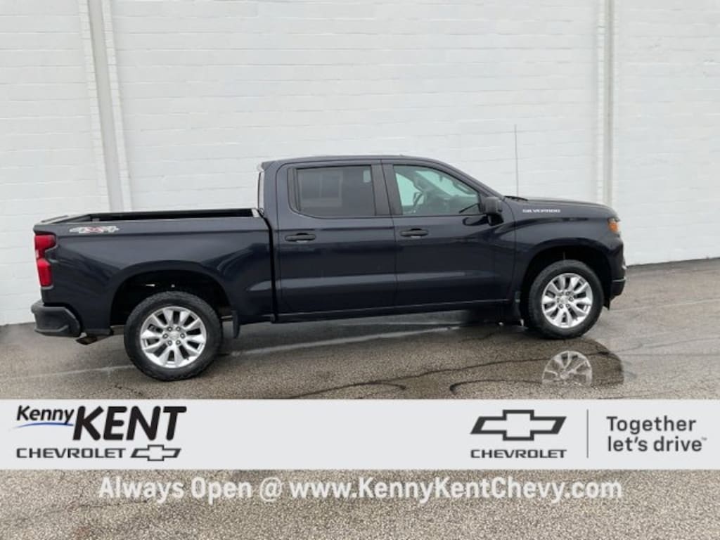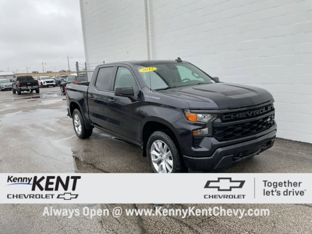Dark Ash Metallic 2022 Chevrolet Silverado 1500 Custom 4WD Silverado 1500 Custom, 4D Crew Cab, 2.7L Turbo, 8-Speed Automatic, 4WD, Dark Ash Metallic, Black Cloth.CARFAX One-Owner. Clean CARFAX.Recent Arrival!We want you to shop With-confidence for your next used Vehicle at Kenny Kent Chevrolet. This pre-owned vehicle was put through an extensive inspection with Master technician's before being offered for sale. We offer Nationwide Shipping ask one of our Associates for A Free Quote. Is financing important to your buying decision? Good, bad or no credit? No matter! Kenny Kent Chevrolet has a full arsenal of over 50 banks providing multiple lending options, to help you decide the payment that fits your budget and needs. We'll save you money at every turn and earn your business for years to come. Your satisfaction is our TOP priority. Please ask us about the remaining Factory Warranty so you can confidently know if you are covered by the Manufacturer if not Don't Worry!!! We offer Protection from MPP Service Contract's on all of our vehicles we sell. Kenny Kent Chevrolet has the best price and value combination in the marketplace. And best of all, you'll love your purchase experience as we are a Lifetime Carfax Certified Dealer. See additional info and our full inventory at KennyKentChevy.com. Come find out why people have been buying their vehicles from Kenny Kent Chevrolet for over 85 years. Kenny Kent Chevrolet is located right off the Lloyd Expressway in Evansville Indiana that's Right up the Road from Everywhere.We are Within 5 Miles from Evansville Regional Airport and offer a Free Shuttle to the dealership for convenience for out of town customers.